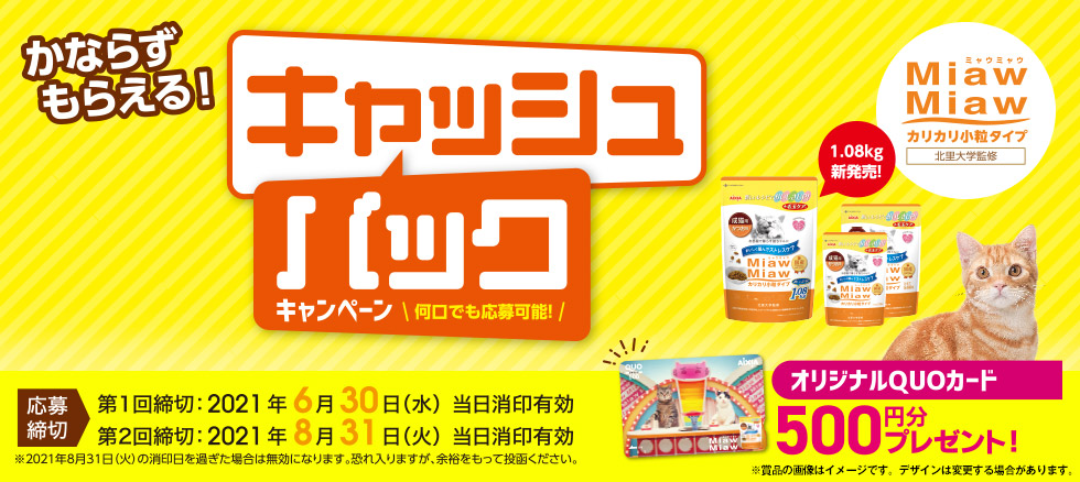 | 応募先 | 〒158-8570 東京都世田谷区瀬田3-15-10 「MiawMiawカリカリ小粒タイプ」キャッシュバックキャンペーン係 |
